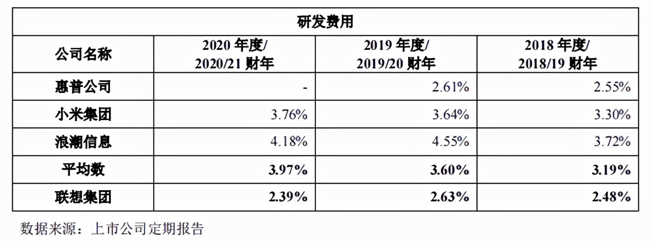 2018年至2020年,联想研发投入占各期收入的比例分别为 2.98%、3.27%和 2.92%;小米集团和浪潮信息同期的研发费用占收入的比例均高于联想。