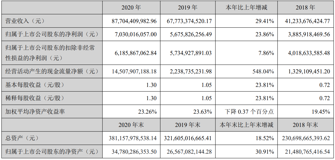 根据财报,金科股份2020年实现营业收入877亿元,同比增长 29.41%;实现净利润97亿元,同比增长52.66%;归属于上市公司股东的净利润70.30亿元,同比增长23.86%。