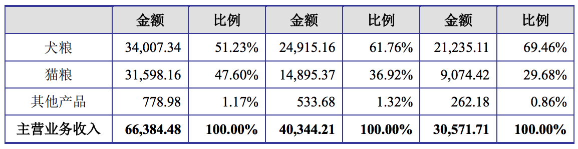 招股书显示,福贝宠物来自于犬粮的收入分别为2.21亿元、2.49亿元与3.40亿元,2019年、2020年的增幅分别为12.67%、36.54%。相比之下,其猫粮收入的增速则分别为64.15%、112.14%。