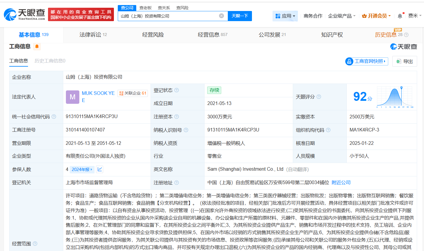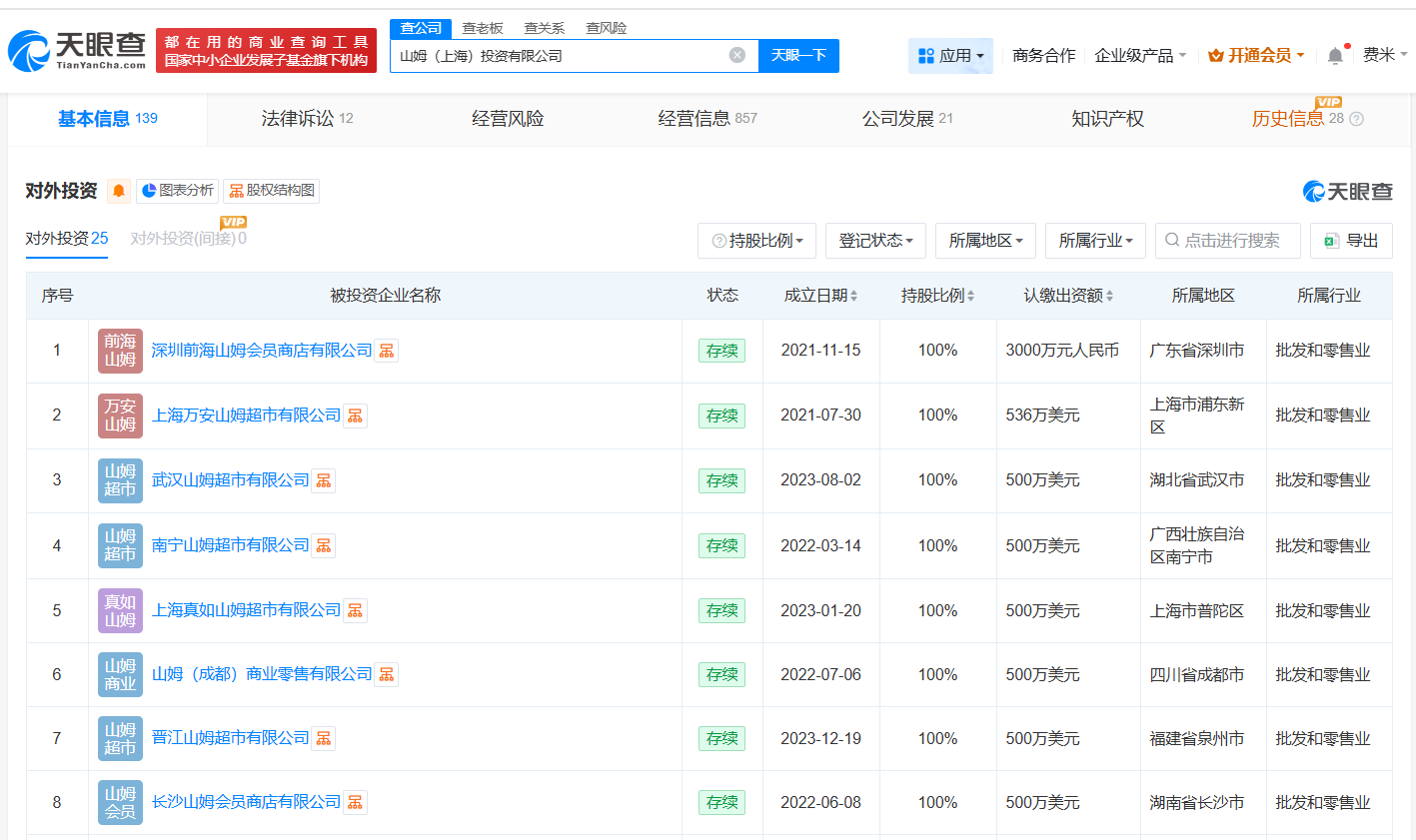 天眼查App显示,山姆中国关联公司山姆(上海)投资有限公司成立于2021年5月,法定代表人为MUK SOOK YEE,注册资本3000万美元,经营范围包括道路货物运输、第二类增值电信业务、第一类增值电信业务等,由Eastern Holdings S.à r.l.全资持股。对外投资信息显示,该公司对外投资25家企业,均为存续状态,包括深圳前海山姆会员商店有限公司、武汉山姆超市有限公司、上海万安山姆超市有限公司等。