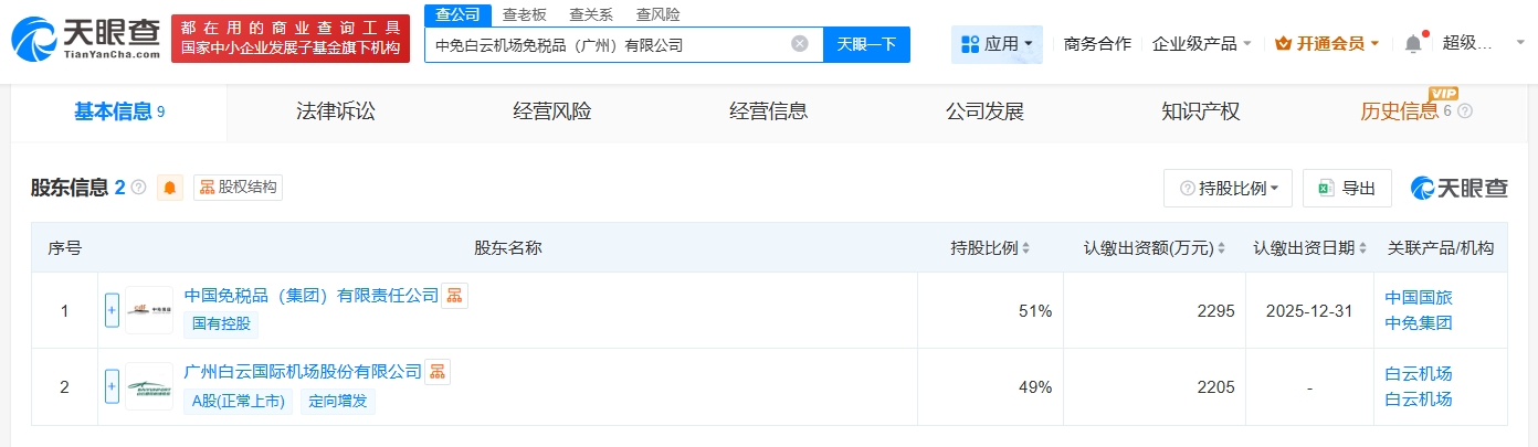 中免集团、白云机场成立免税品公司 注册资本4500万