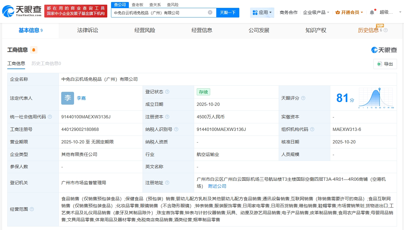 天眼查工商信息显示,近日,中免白云机场免税品(广州)有限公司成立,法定代表人为李嘉,注册资本4500万人民币,经营范围包括食品销售、互联网销售、化妆品零售、电子产品销售等。股东信息显示,该公司由中国免税品(集团)有限责任公司、白云机场(60…