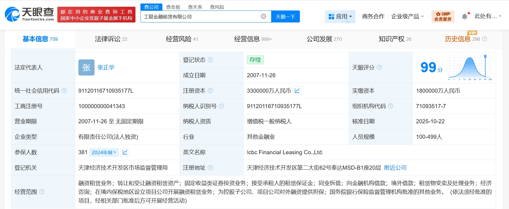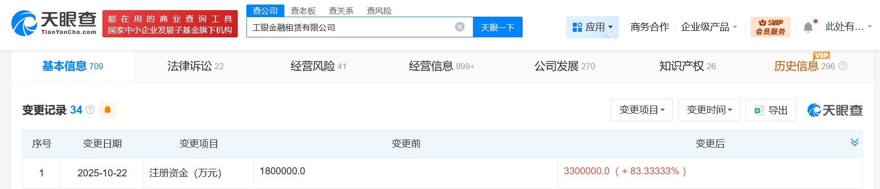 雷达财经讯,天眼查工商信息显示,近日,工银金融租赁有限公司发生工商变更,注册资本由180亿人民币增至330亿人民币,增幅约83%。