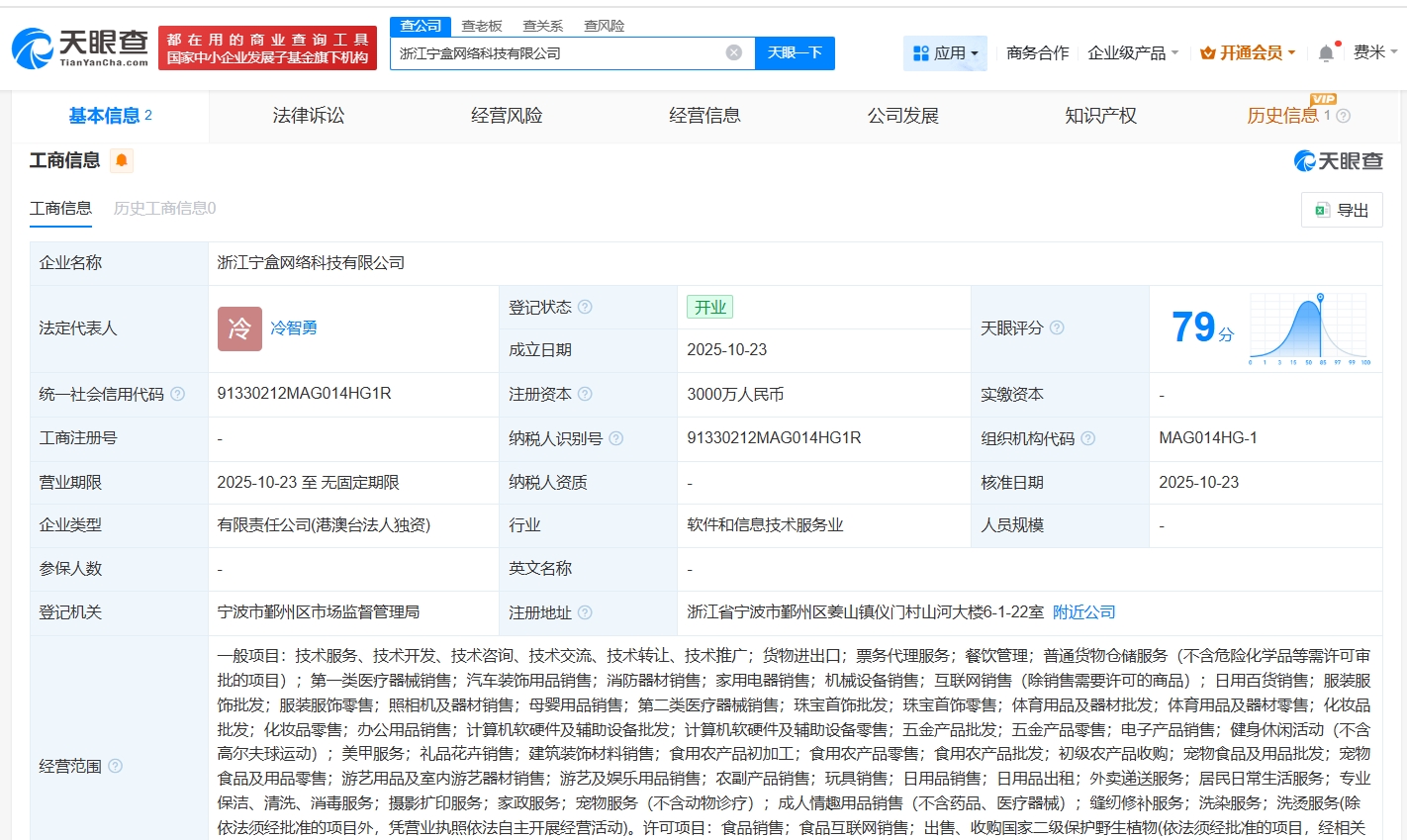 天眼查App显示,近日,浙江宁盒网络科技有限公司成立,法定代表人为冷智勇,注册资本3000万人民币,经营范围包括货物进出口、票务代理服务、餐饮管理等,由盒马(中国)有限公司全资持股…