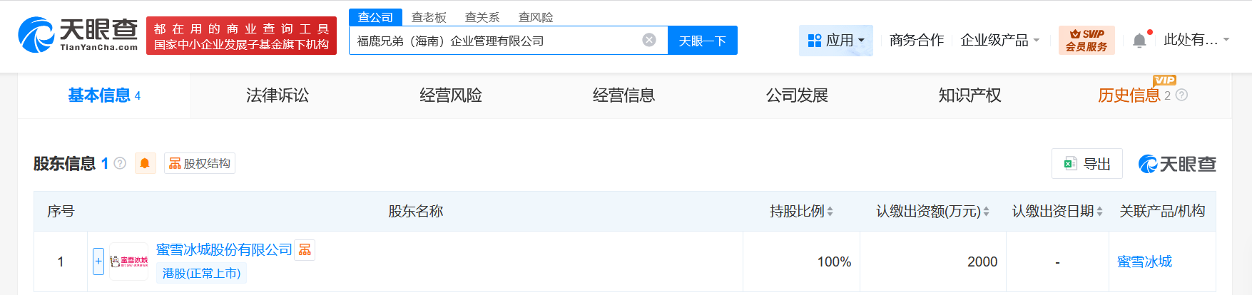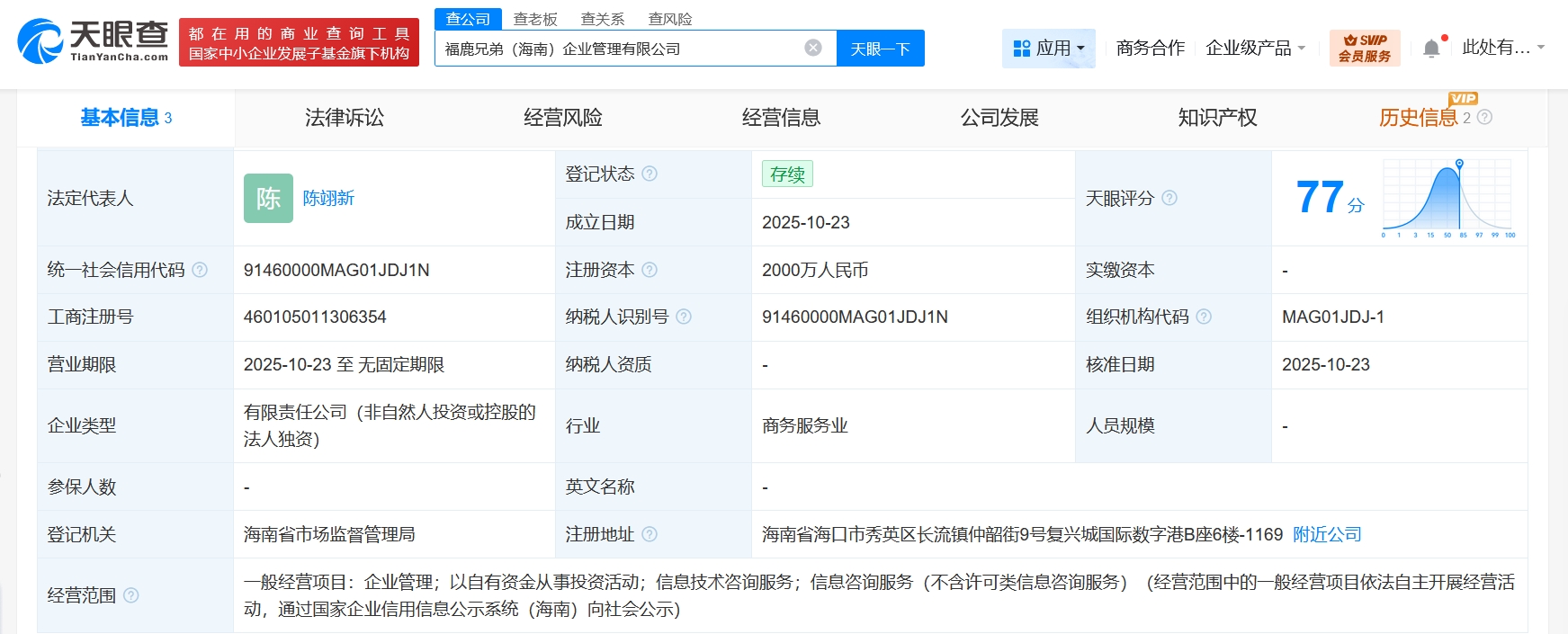 天眼查工商信息显示,近日,福鹿兄弟(海南)企业管理有限公司成立,法定代表人为陈翊新,注册资本2000万人民币,经营范围为企业管理、以自有资金从事投资活动、信息技术咨询服务、信息咨询服务。股东信息显示,该公司由蜜雪冰城股份有限公司全资持股…