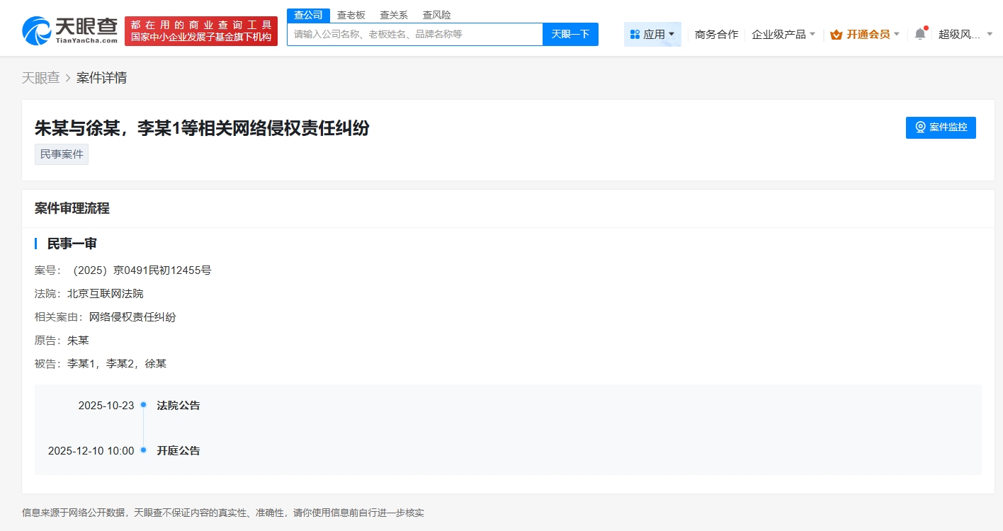 天眼查App显示,10月23日,北京互联网法院向徐某某公告送达起诉状副本及证据材料、开庭传票等,涉及与朱一龙相关网络侵权责任纠纷案件,被告共3人。自公告发出之日起经过30日即视为送达,并定于举证期满后的第3日上午开庭审理…