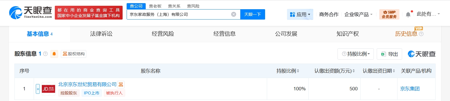 雷达财经讯,天眼查工商信息显示,近日,京东家政服务(上海)有限公司成立,法定代表人为郭兴伟,注册资本500万人民币,经营范围含家政服务、信息技术咨询服务、市场营销策划、普通货物仓储服务、包装材料及制品销售、服装服饰零售、家用电器销售、人力资源服务、企业管理咨询等。股东信息显示,该公司由北京京东世纪贸易有限公司全资持股。