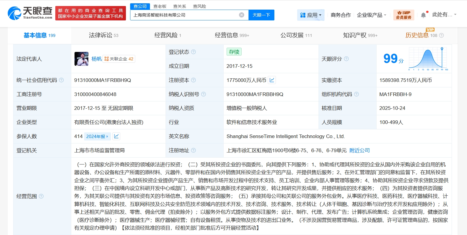 天眼查工商信息显示,近日,上海商汤智能科技有限公司发生工商变更,注册资本由162.5亿人民币增至177.5亿人民币,增幅约9%…