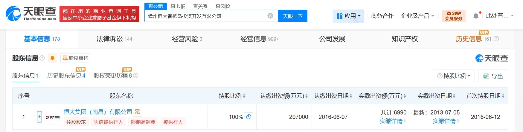 儋州恒大香槟岛投资开发有限公司成立于2010年12月,法定代表人为郑同刚,注册资本20.7亿人民币,经营范围为房地产开发与经营、室内装饰工程、制冷空调设备安装、旅游开发服务、旅游物业管理、旅游项目投资建设和管理、海水养殖。股东信息显示,该公司由恒大集团(南昌)有限公司全资持股。