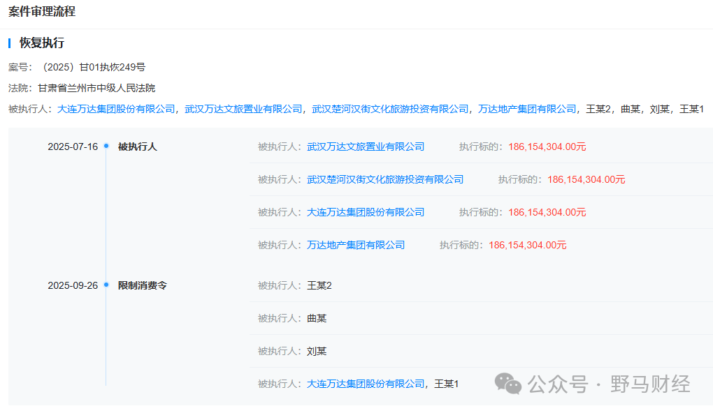 万达集团受资金之困两年多,此前王健林三次成为被执行人,这是首次被限制高消费。该限消令由甘肃省兰州市中级人民法院发放,案号为(2025)甘01执恢249号,被追债的名单中,除了万达集团和万达地产集团有限公司(简称“万达地产”),还有武汉万达文旅、武汉楚河汉街文化旅游投资有限公司。
