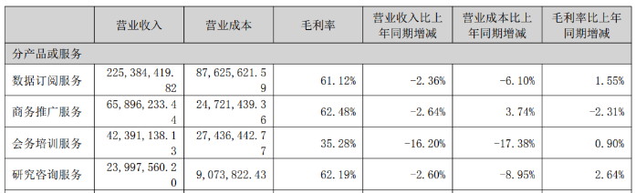 证券之星注意到,数据订阅服务、商务推广服务、研究咨询服务的毛利率均在60%以上,但过低的收入占比使其难以拉动业绩增长。