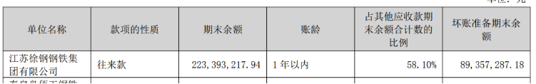 按期末余额前五名的情况来看,来自徐钢集团的应收款余额为2.23亿元,占其他应收款期末余额合计数的58.1%,计提的坏账准备期末余额为8935.73万元。