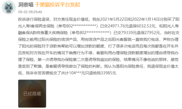 进入9月,投诉集中爆发。9月2日,另有投诉者自述称,因使用阳光信贷产品,被客服以“买保险可增加贷款额度”诱导,先后购买两款保险,退保时现金价值过低,累计交保费超10万元仅退33985元,认为受到欺骗。