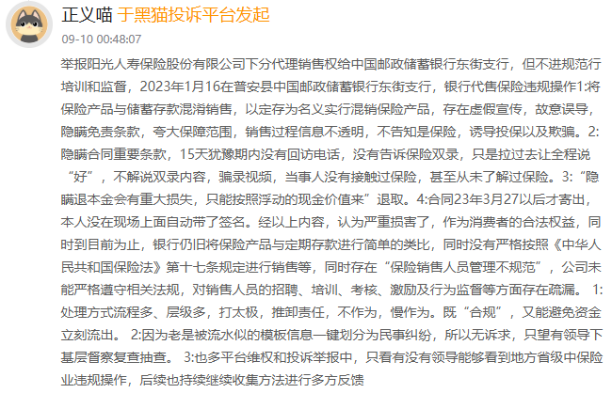 9月4日,有消费者在发起投诉时表示,2018-2019年被阳光人寿在不知情下购买9笔人生意外险,涉及金额7万多元,其援引相关监管规定,指阳光人寿勾结马上金融捆绑销售保险违规,要求无条件退保。9月10日,再次投诉,称阳光人寿在邮政储蓄银行东街支行的代销环节存在诸多问题,包括保险与储蓄混淆销售、虚假宣传、隐瞒合同条款、双录欺骗、合同延迟寄出且带非本人现场签名的自动签名等。