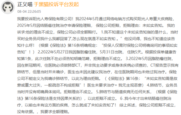 8月4日,有消费者在黑猫平台投诉称,其2024年5月通过网络电销购买阳光人寿重大疾病险,2025年5月因结肠癌住院申请理赔时被拒,理由是“未如实告知”。消费者据《保险法》第16条反驳,强调仅需对保险公司明确询问事项如实告知,且自身肺结节未确诊、与肠道疾病无因果关系,拒赔无依据,要求全额赔付。截至9月30日,该投诉目前仍在处理中。