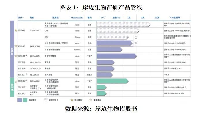 截至2025年6月10日,岸迈生物已经开发了8款药品项目,因关键产品EMB-06同时在肿瘤和自身免疫性疾病领域相关适应证均开展了临床试验,该公司招股书中所列示在研管线合计有9个。其中,仅核心产品EMB-01、关键产品EMB-06、EMB-073款产品进入了临床试验,另外5款尚处于临床前试验阶段。