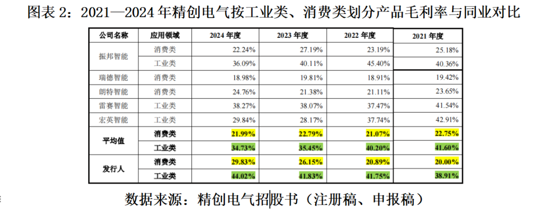 招股书还显示,按消费类、工业类分类的产品毛利率对比,精创电气消费类、工业类产品毛利率在2021年均低于同期同业均值,在2024年却明显高于同期同业均值,且分别高出7.84个、9.29个百分点。