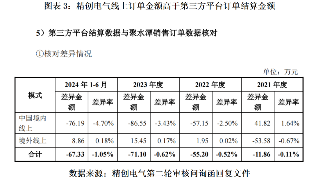 然而,北交所在第二轮审核问询函中指出,2021—2024年上半年,精创电气在亚马逊、京东、天猫等境内外线上销售平台的各期订单结算金额小于其线上订单自动对接平台聚水潭业务系统的各期线上订单金额,差额在11万~72万元区间,而该公司聚水潭业务系统的各期线上订单金额又进一步小于其金蝶ERP财务系统的各期出库单金额,差额在20万~185万元区间。