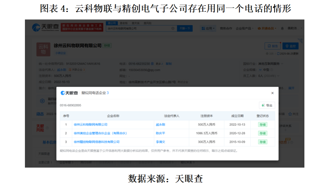招股书还显示,云科物联是精创电气的非关联方。但天眼查数据显示,2024年之前,云科物联的联系电话为0516-68902895,该号码亦曾是精创电气全资子公司徐州精创物联网信息科技有限公司(下称“精创物联”)、员工持股平台徐州美控企业管理合伙企业(有限合伙)(下称“徐州美控”)的联系电话。