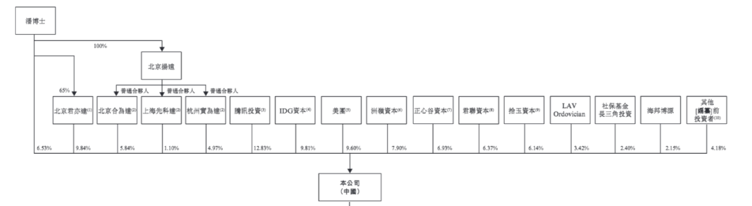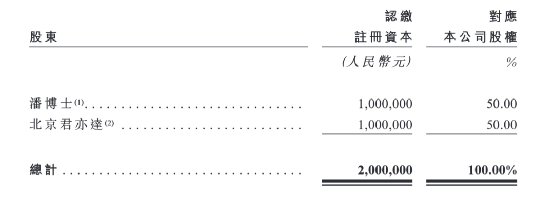 公司初始股权结构中,潘海直接持有50%的股份,另外50%则由潘海与凯因科技联合设立的北京君亦达生物科技有限责任公司(以下简称“北京君亦达”,双方各持股65%、35%)持有。