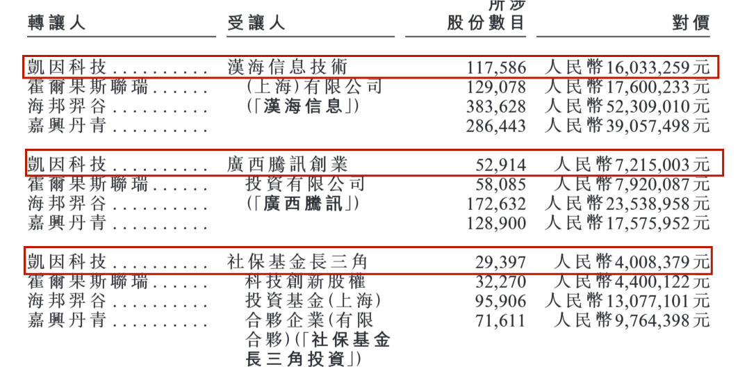 具体来看,凯因科技此次分别向美团-W(3690.HK)旗下的汉海信息、腾讯控股(0700.HK)旗下的广西腾讯及社保基金长三角投资转让了117,586股、52,914股、29,397股,合计套现约2725.66万元。