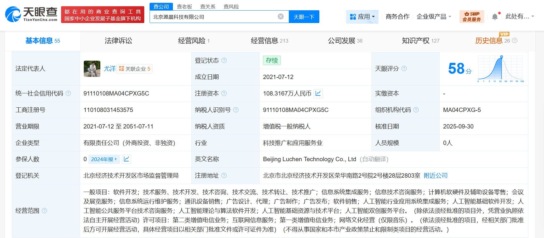 北京潞晨科技有限公司成立于2021年7月,法定代表人为尤洋,经营范围含信息系统集成服务、信息技术咨询服务、计算机软硬件及辅助设备零售、人工智能行业应用系统集成服务、人工智能基础软件开发、人工智能公共服务平台技术咨询服务、互联网信息服务等。股东信息显示,该公司现由尤洋及上述新增股东共同持股。