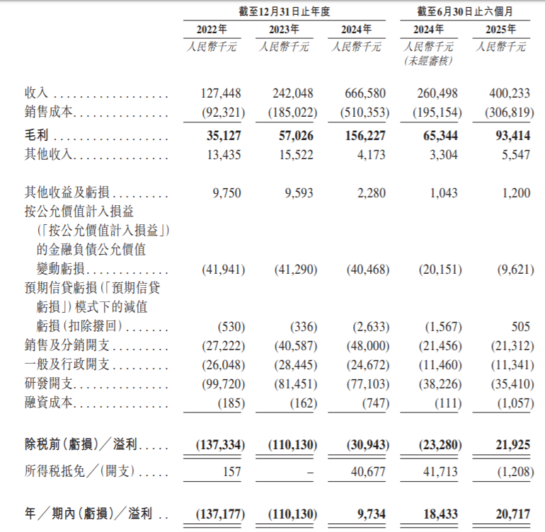 于2022年、2023年、2024年以及截至2025年6月30日止6个月期间,公司收入分别为人民币1.27亿元、2.42亿元、6.67亿元及4.00亿元;年╱期内溢利为-1.37亿元-1.10亿元、973.4万元及2071.7万元,2024年实现扭亏为盈。