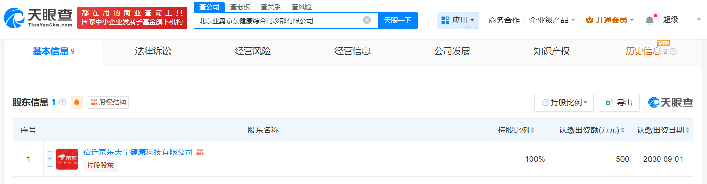 雷达财经讯,天眼查App显示,近日,北京亚奥京东健康综合门诊部有限公司成立,法定代表人为顾绍江,注册资本500万人民币,经营范围包括诊所服务、远程健康管理服务、服装服饰零售等,由宿迁京东天宁健康科技有限公司全资持股。