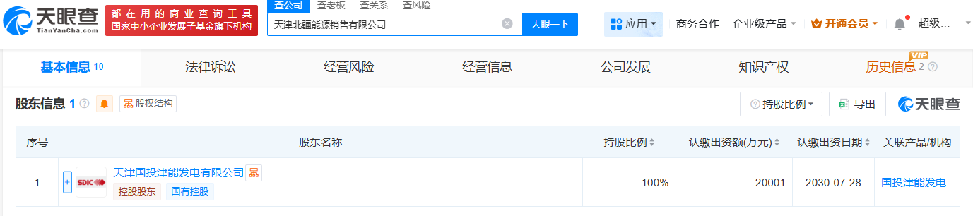 雷达财经讯,天眼查App显示,近日,天津北疆能源销售有限公司成立,法定代表人为苏大鹏,注册资本约2亿人民币,经营范围包括热力生产和供应、供冷服务、海水淡化处理、充电桩销售、集中式快速充电站等,由天津国投津能发电有限公司全资持股。