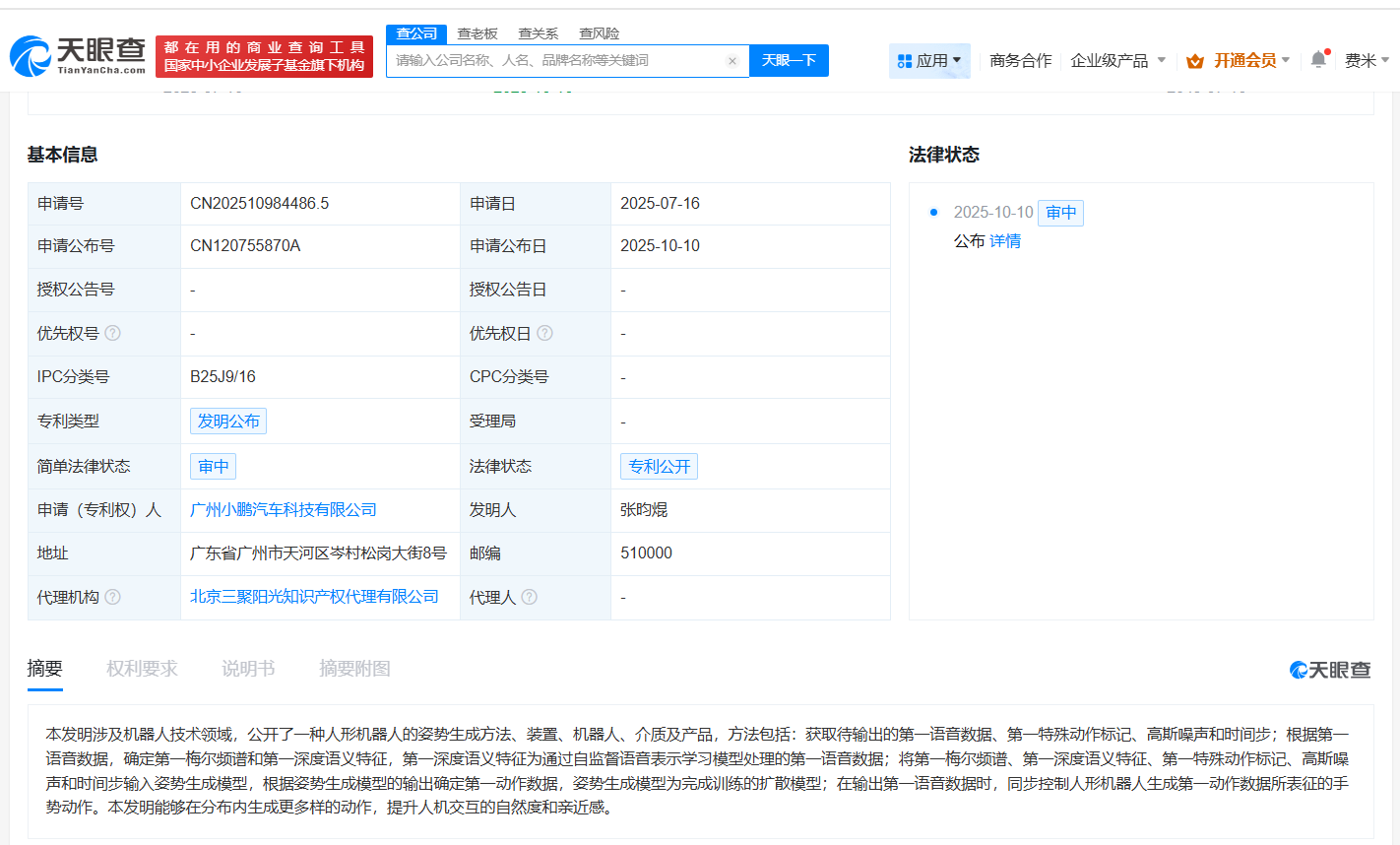 雷达财经讯,天眼查App显示,10月10日,广州小鹏汽车科技有限公司申请的“人形机器人的姿势生成方法、装置、机器人、介质及产品”专利公布。