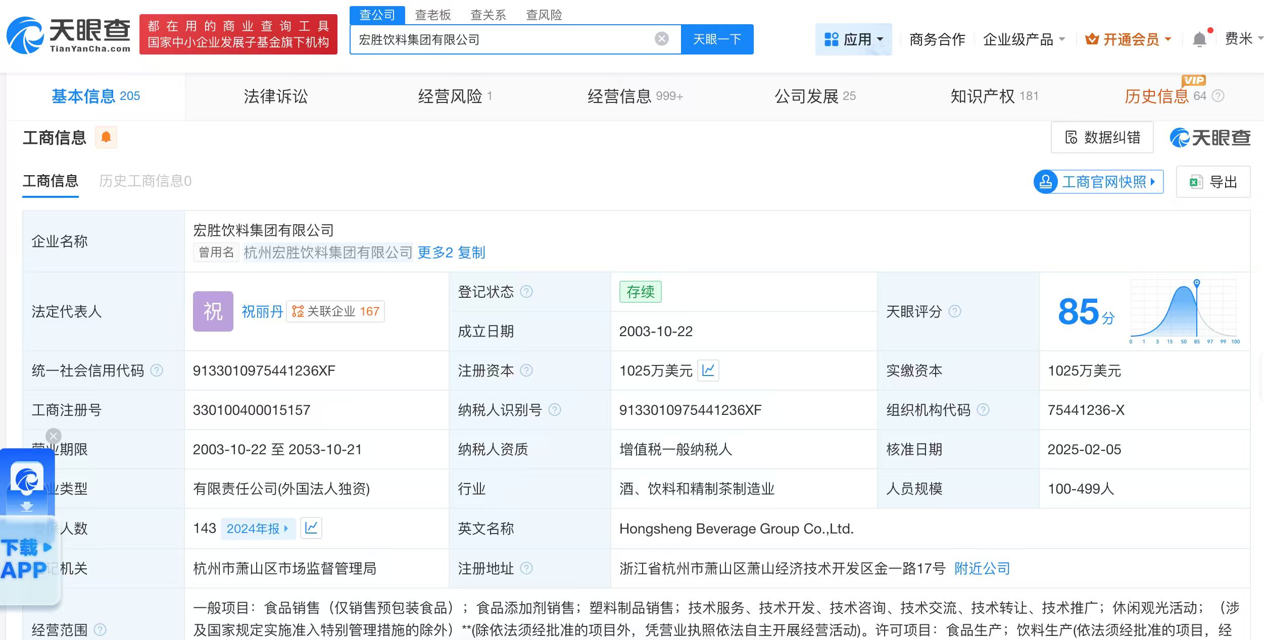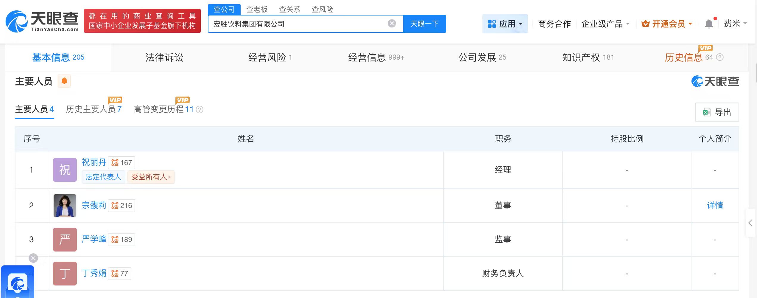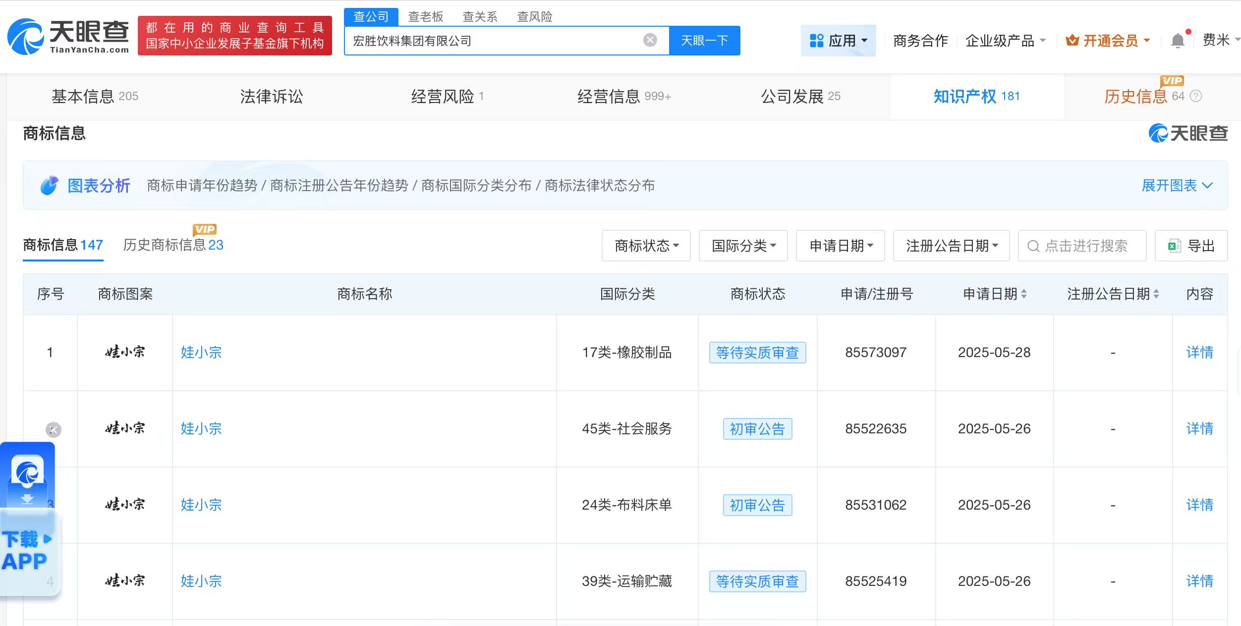 天眼查知识产权信息显示,今年以来,宏胜饮料集团有限公司已申请注册多枚“娃小宗”“宗小哈”“娃小哈”商标,国际分类涉及食品、啤酒饮料、广告销售等。其中,多枚“娃小宗”“宗小哈”商标状态为初审公告。宏胜饮料集团有限公司成立于2003年10月,法定代表人为祝丽丹,注册资本1025万美元,经营范围包括食品销售、食品添加剂销售、塑料制品销售等,由恒枫贸易有限公司全资持股,宗馥莉在该公司担任董事。