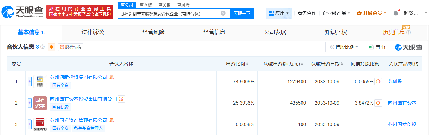 雷达财经讯,天眼查工商信息显示,近日,苏州新创未来股权投资合伙企业(有限合伙)成立,执行事务合伙人为苏州国发资产管理有限公司,出资额171.5亿人民币,经营范围包括股权投资、创业投资、以自有资金从事投资活动。合伙人信息显示,该合伙企业由苏州创新投资集团有限公司、苏州国有资本投资集团有限公司、苏州国发资产管理有限公司共同出资。