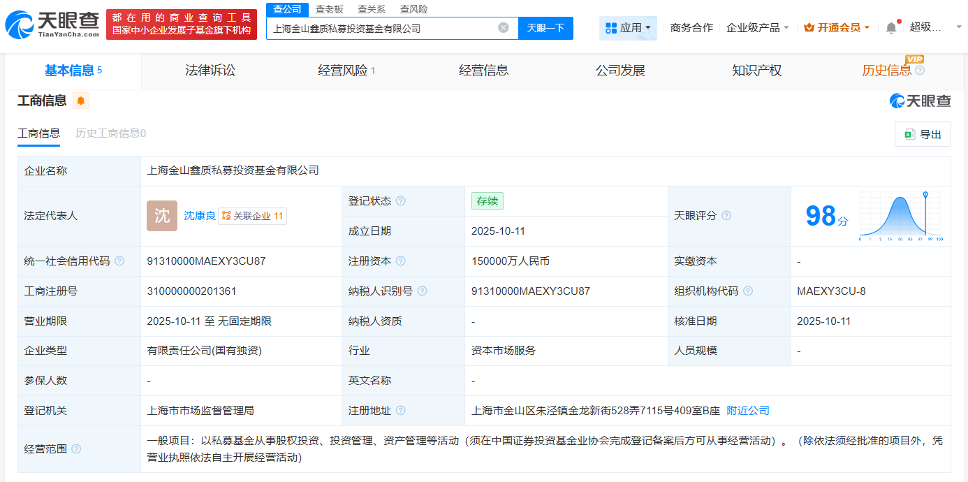 雷达财经讯,天眼查工商信息显示,近日,上海金山鑫质私募投资基金有限公司成立,法定代表人为沈康良,注册资本15亿人民币,经营范围包括以私募基金从事股权投资、投资管理、资产管理等活动。股东信息显示,该公司由上海金山资本管理集团有限公司全资持股。