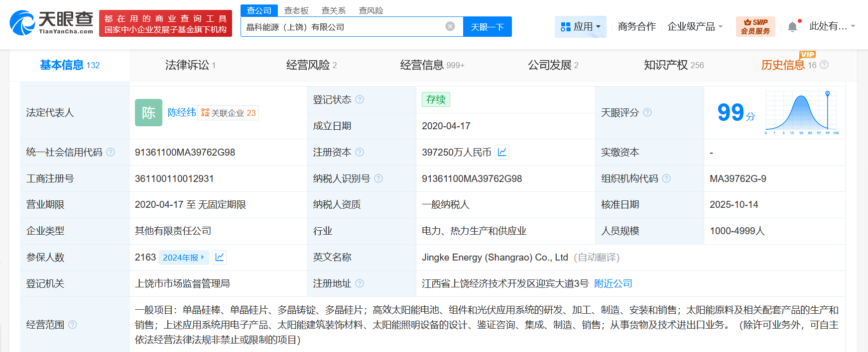 雷达财经讯,天眼查工商信息显示,近日,晶科能源(上饶)有限公司发生工商变更,注册资本由35亿人民币增至约39.7亿人民币,增幅13.5%。