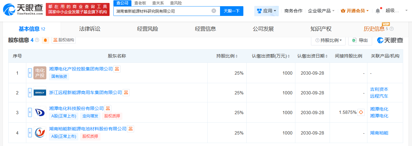雷达财经讯,天眼查工商信息显示,近日,湖南省新能源材料研究院有限公司成立,法定代表人为刘干江、注册资本4000万人民币,经营范围包括新材料技术研发、新材料技术推广服务、以自有资金从事投资活动等。股东信息显示,该公司由湘潭电化(002125)、湖南裕能(301358)、浙江远程新能源商用车集团有限公司、湘潭电化产投控股集团有限公司共同持股。