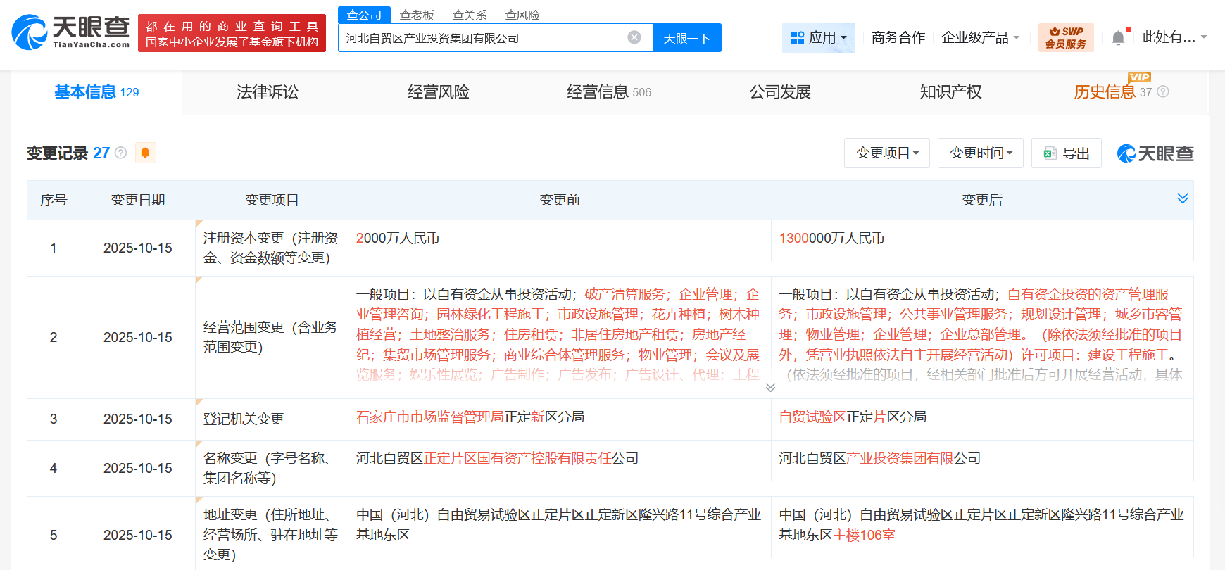 天眼查App显示,10月15日,河北自贸区正定片区国有资产控股有限责任公司发生工商变更,企业名称变更为河北自贸区产业投资集团有限公司,同时,注册资本由2000万人民币增至130亿人民币,增幅64900%…