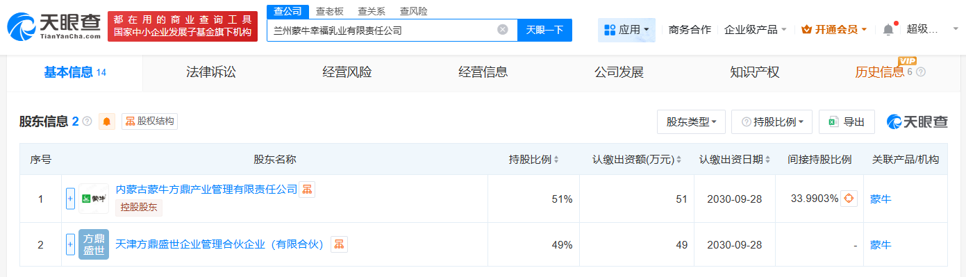 雷达财经讯,天眼查App显示,近日,兰州蒙牛幸福乳业有限责任公司成立,法定代表人为赵海宁,注册资本100万人民币,经营范围包括互联网直播技术服务、食品互联网销售等,由内蒙古蒙牛方鼎产业管理有限责任公司、天津方鼎盛世企业管理合伙企业(有限合伙)共同持股。