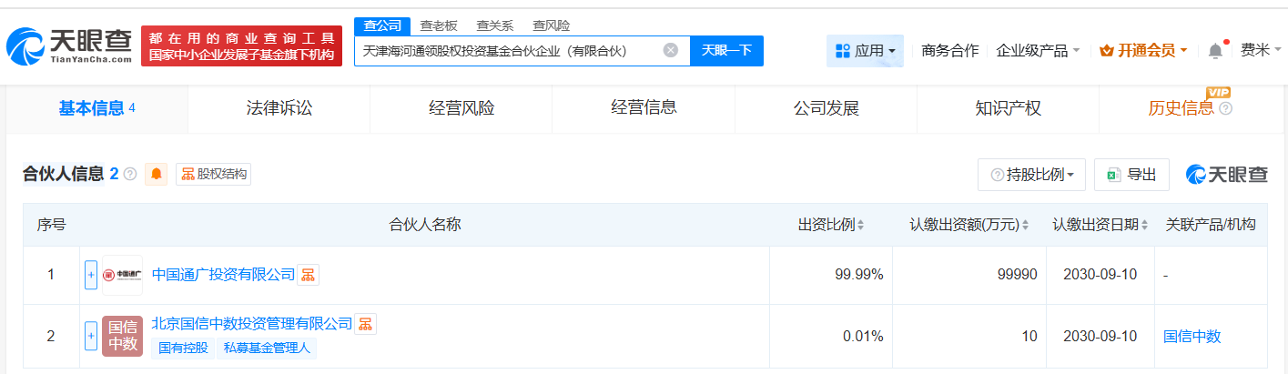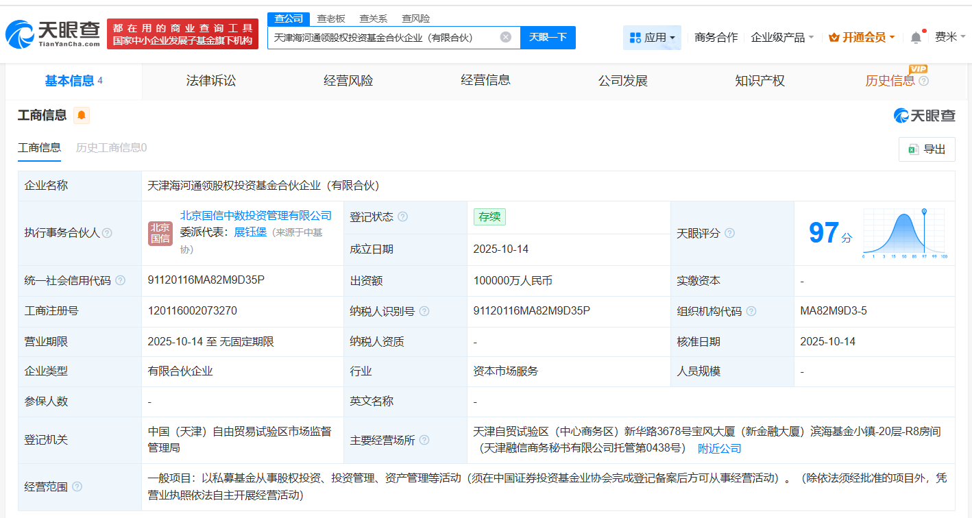 雷达财经讯,天眼查App显示,近日,天津海河通领股权投资基金合伙企业(有限合伙)成立,执行事务合伙人为北京国信中数投资管理有限公司,出资额10亿人民币,经营范围为以私募基金从事股权投资、投资管理、资产管理等活动,由中国通广投资有限公司、北京国信中数投资管理有限公司共同出资。