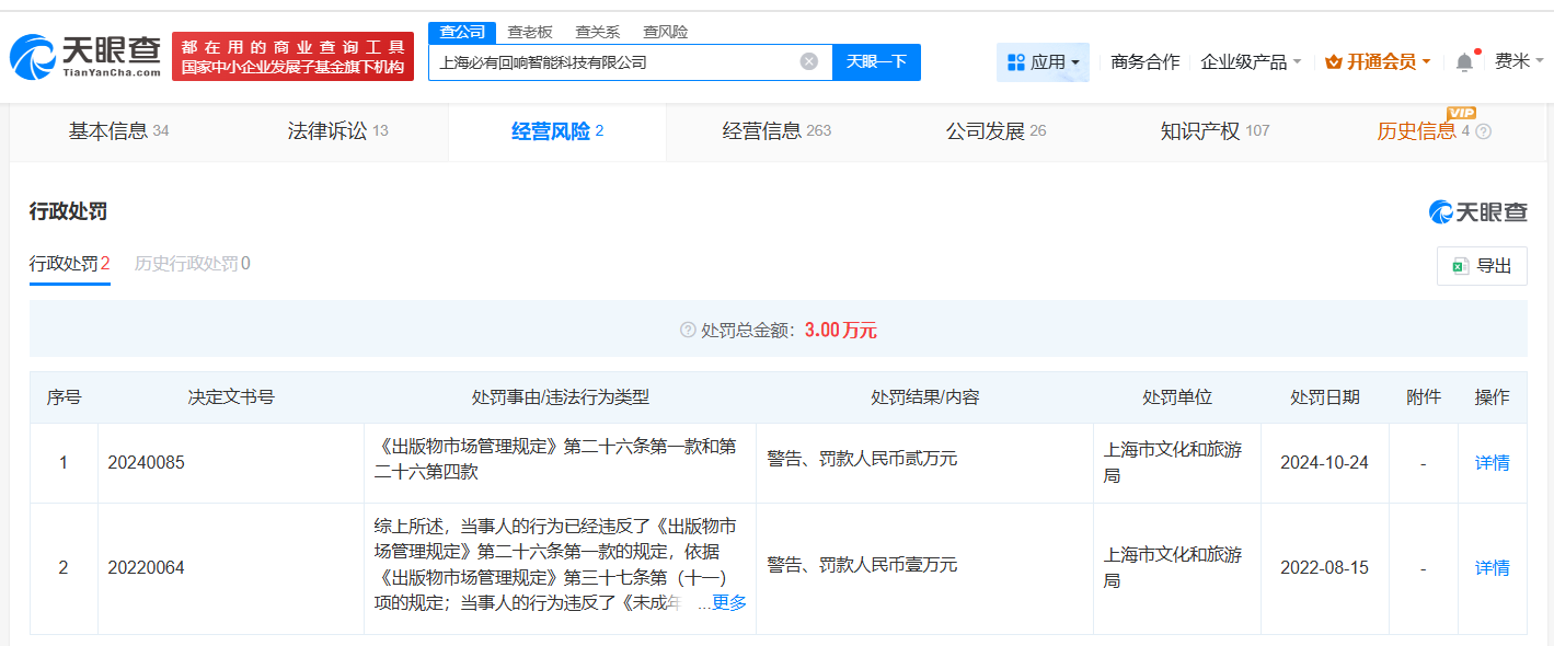 天眼查App显示,千岛App关联企业上海必有回响智能科技有限公司成立于2021年4月,法定代表人为沈振宇,注册资本1000万人民币,经营范围包括计算机系统服务、互联网销售、信息系统集成服务等,由沈振宇、西藏御珠企业管理有限公司、李论共同持股。法律诉讼信息显示,该公司曾涉及信息网络买卖合同纠纷、买卖合同纠纷、产品销售者责任纠纷等案件。此外,该公司曾因违反《出版物市场管理规定》被罚。