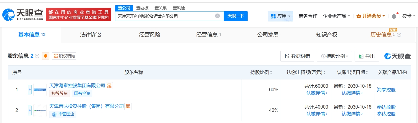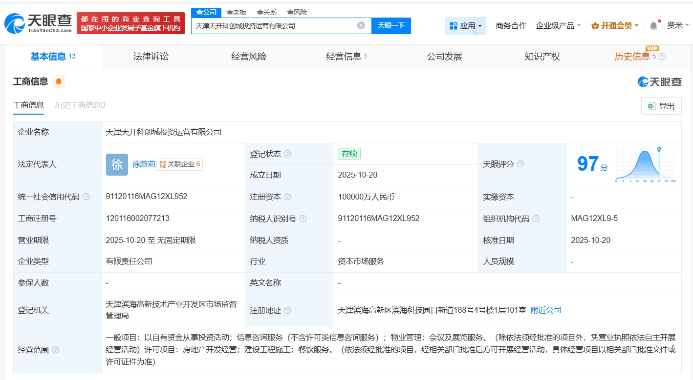 雷达财经讯,天眼查App显示,近日,天津天开科创城投资运营有限公司成立,法定代表人为徐蔚莉,注册资本10亿人民币,经营范围包括以自有资金从事投资活动、信息咨询服务、物业管理等。股东信息显示,该公司由天津海泰控股集团有限公司、天津泰达投资控股(集团)有限公司共同持股。