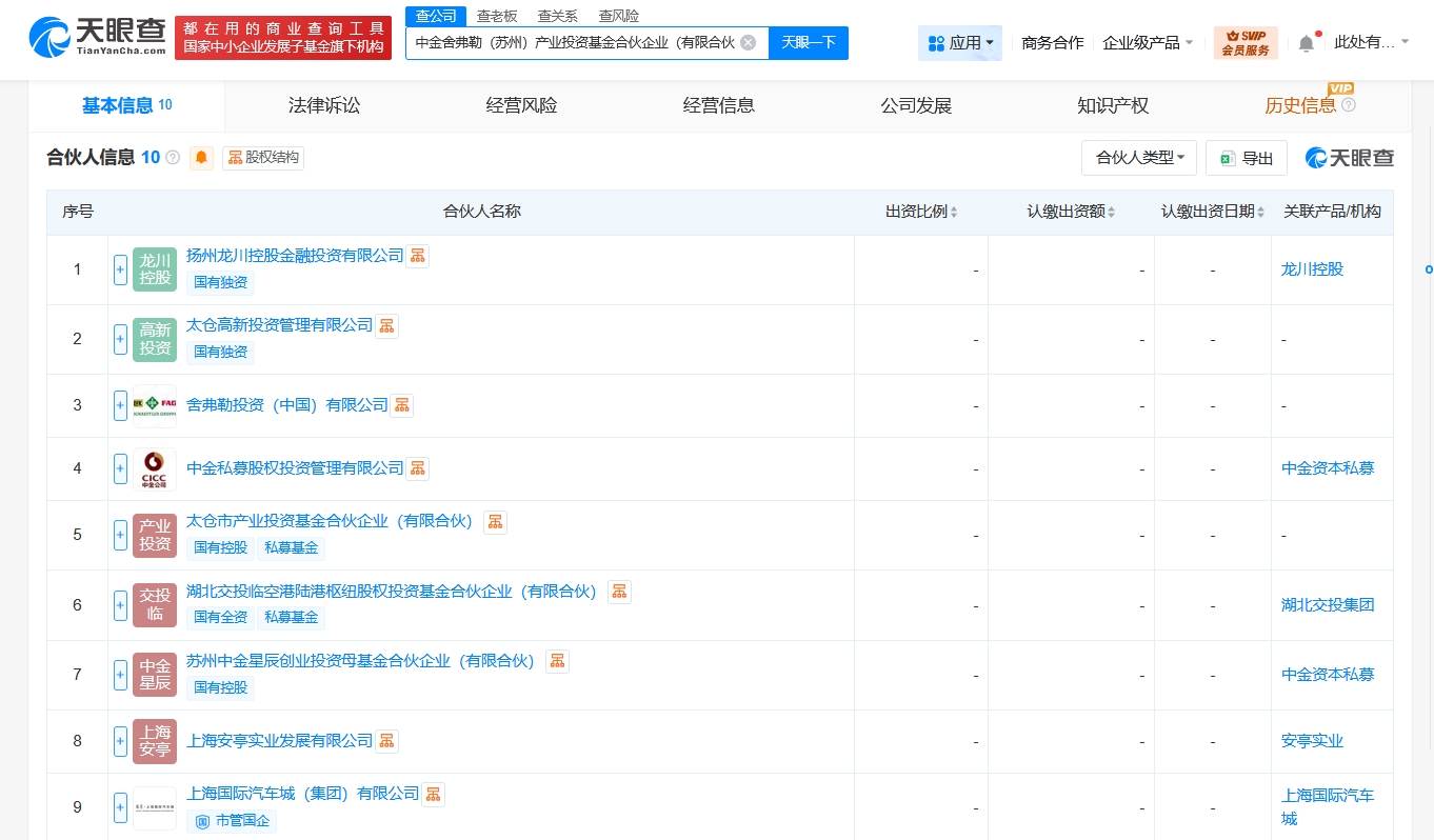 雷达财经讯,天眼查工商信息显示,近日,中金舍弗勒(苏州)产业投资基金合伙企业(有限合伙)成立,执行事务合伙人为中金私募股权投资管理有限公司,出资额10.1亿人民币,经营范围为创业投资、股权投资。合伙人信息显示,该基金由扬州龙川控股金融投资有限公司、太仓高新投资管理有限公司、舍弗勒投资(中国)有限公司、中金私募股权投资管理有限公司等共同出资。