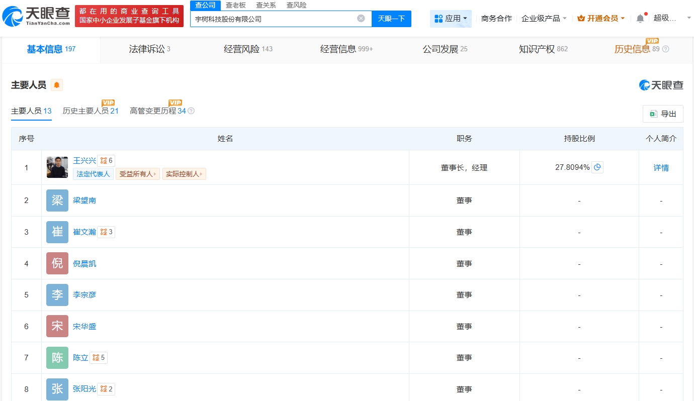 雷达财经讯,天眼查工商信息显示,10月23日,杭州宇树科技股份有限公司发生工商变更,企业名称变更为宇树科技股份有限公司,同时王兴兴由执行公司事务的董事变更为董事长。