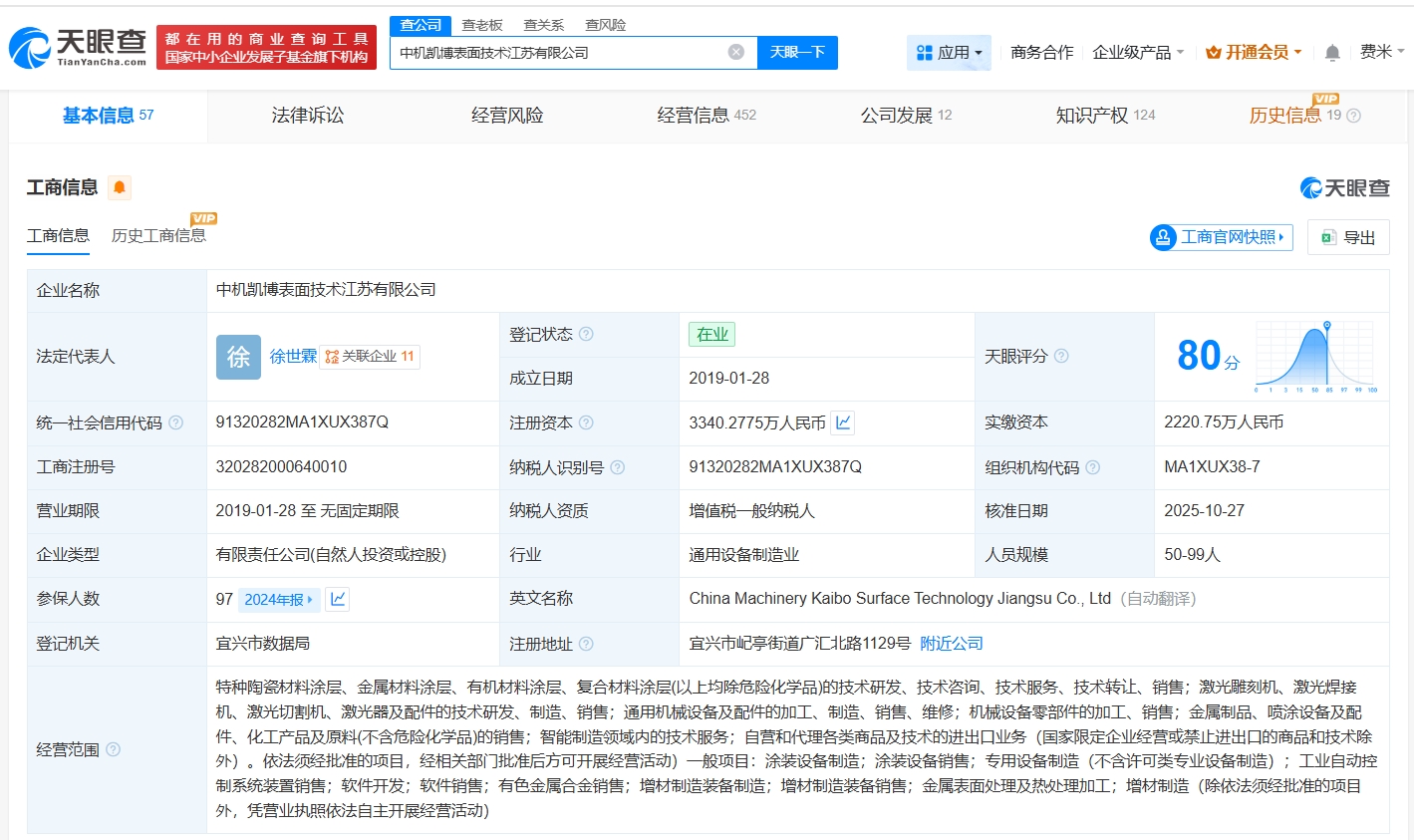 中机凯博表面技术江苏有限公司成立于2019年1月,法定代表人为徐世霖,经营范围包括激光雕刻机、激光焊接机、激光切割机、激光器及配件的技术研发、制造、销售等,现由徐世霖、淮安博冠寰企业管理合伙企业(有限合伙)及上述新增股东等共同持股。官网显示,该公司是一家专注于为国内外客户提供防腐、耐磨、绝缘、耐高温、超小内孔及特殊领域等中高端表面涂层解决方案的专业化公司。