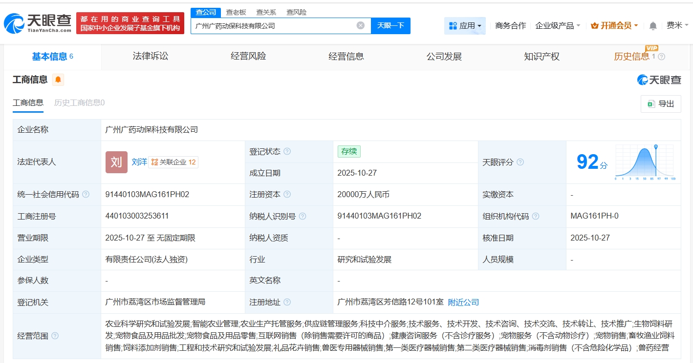 天眼查App显示,近日,广州广药动保科技有限公司成立,法定代表人为刘洋,注册资本2亿人民币,经营范围包括农业科学研究和试验发展、智能农业管理、农业生产托管服务等,由广州神农现代农业有限公司全资持股,后者为广州医药集团有限公司的全资子公司…
