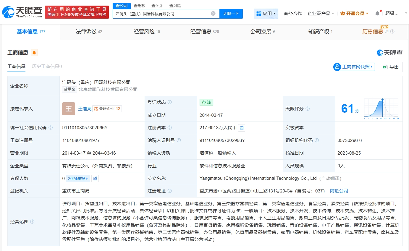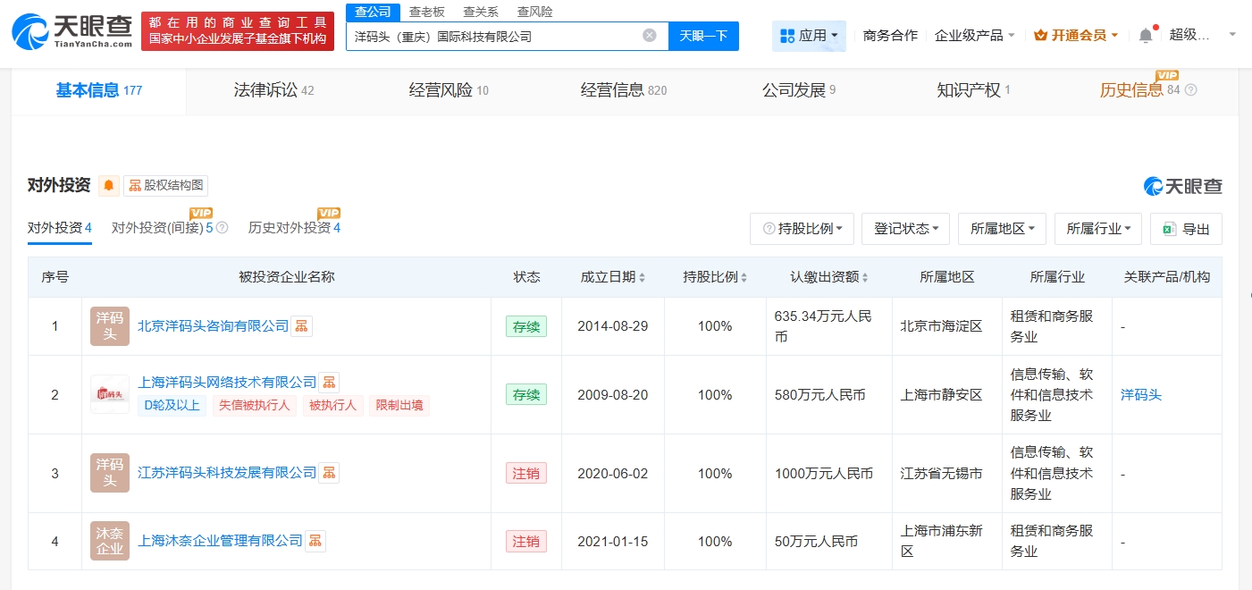 雷达财经讯,天眼查App显示,近日,洋码头(重庆)国际科技有限公司因通过登记的住所或者经营场所无法联系,被重庆市渝中区市场监督管理局列入经营异常名录。