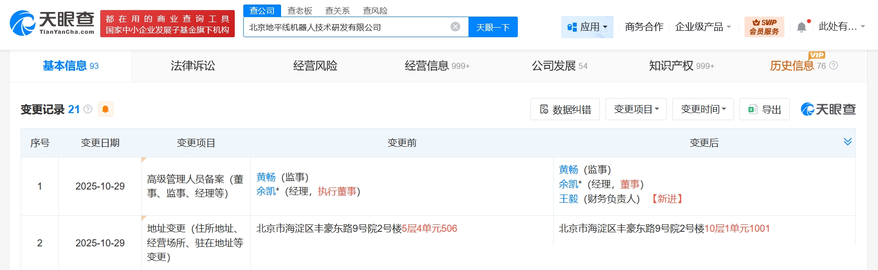 雷达财经讯,天眼查App显示,近日,北京地平线机器人技术研发有限公司发生工商变更,余凯由经理、执行董事变更为经理、董事,新增王毅为财务负责人。