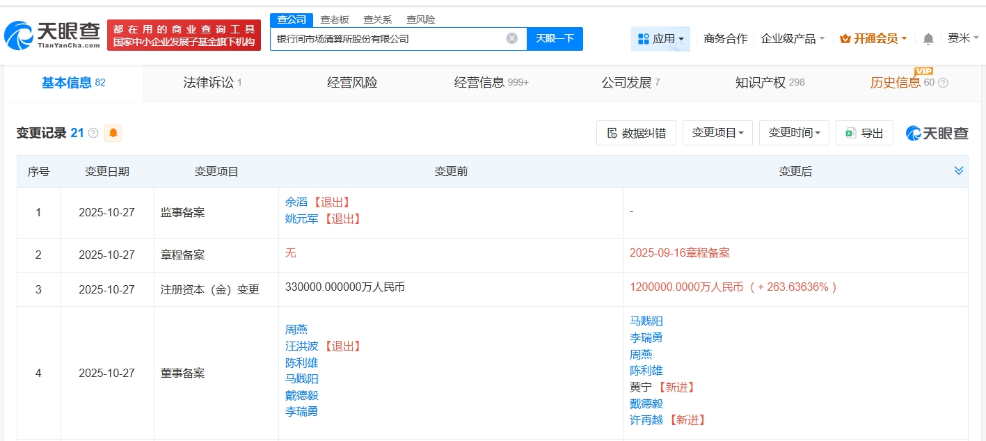 雷达财经讯,天眼查App显示,近日,上海清算所关联公司银行间市场清算所股份有限公司发生工商变更,注册资本由33亿人民币增至120亿人民币,增幅约264%,同时多位高管发生变更。