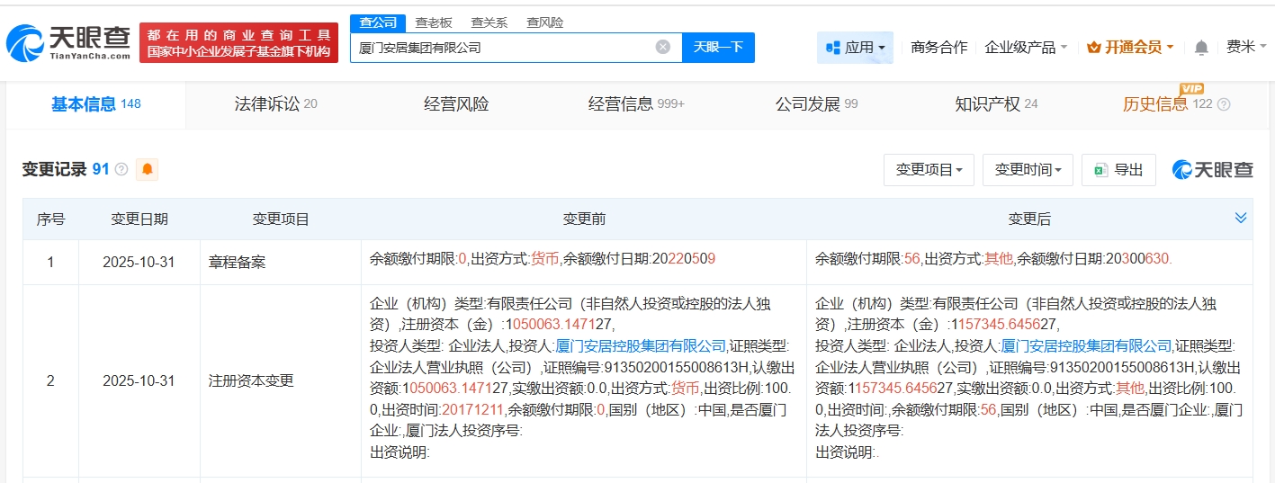雷达财经讯,天眼查工商信息显示,近日,厦门安居集团有限公司发生工商变更,注册资本由约105亿人民币增至约115.7亿人民币。