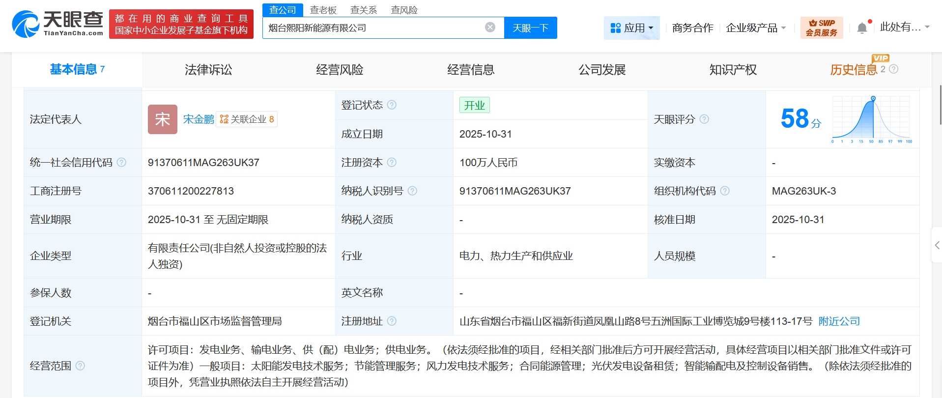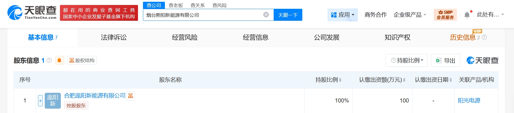雷达财经讯,天眼查工商信息显示,近日,烟台熙阳新能源有限公司成立,法定代表人为宋金鹏,注册资本100万人民币,经营范围含发电业务、输电业务、供(配)电业务,供电业务,太阳能发电技术服务,节能管理服务,风力发电技术服务等。股东信息显示,该公司由阳光电源旗下合肥庞阳新能源有限公司全资持股。