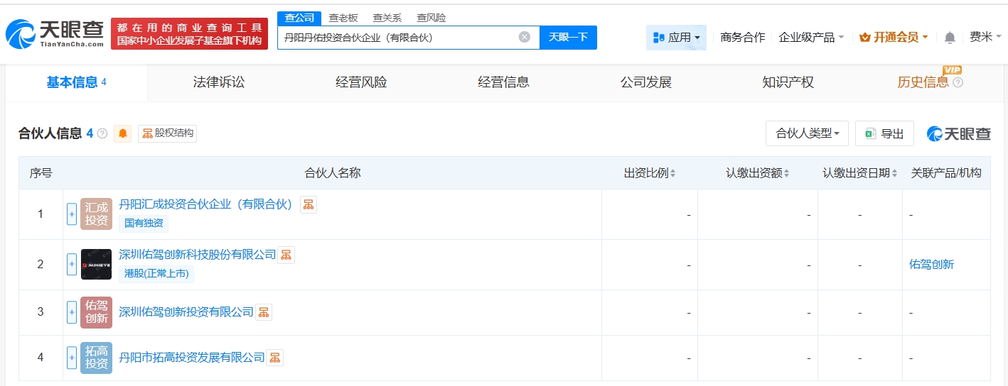 雷达财经讯,天眼查工商信息显示,近日,丹阳丹佑投资合伙企业(有限合伙)成立,出资额约9611万人民币,经营范围为股权投资、以自有资金从事投资活动、融资咨询服务。合伙人信息显示,该合伙企业由丹阳汇成投资合伙企业(有限合伙)、丹阳市拓高投资发展有限公司、佑驾创新(02431.HK)及旗下深圳佑驾创新投资有限公司共同出资。